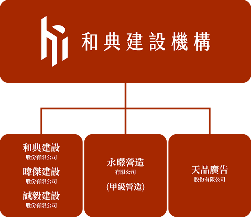 和典建設機構旗下匯聚和典建設、暐傑建設、誠毅建設、永暻營造以及天品廣告五大團隊,營業範圍涵蓋土地開發、都市更新、危老重建、建築營造與建築行銷,一條龍式完整服務,只為創造百分百滿意度。